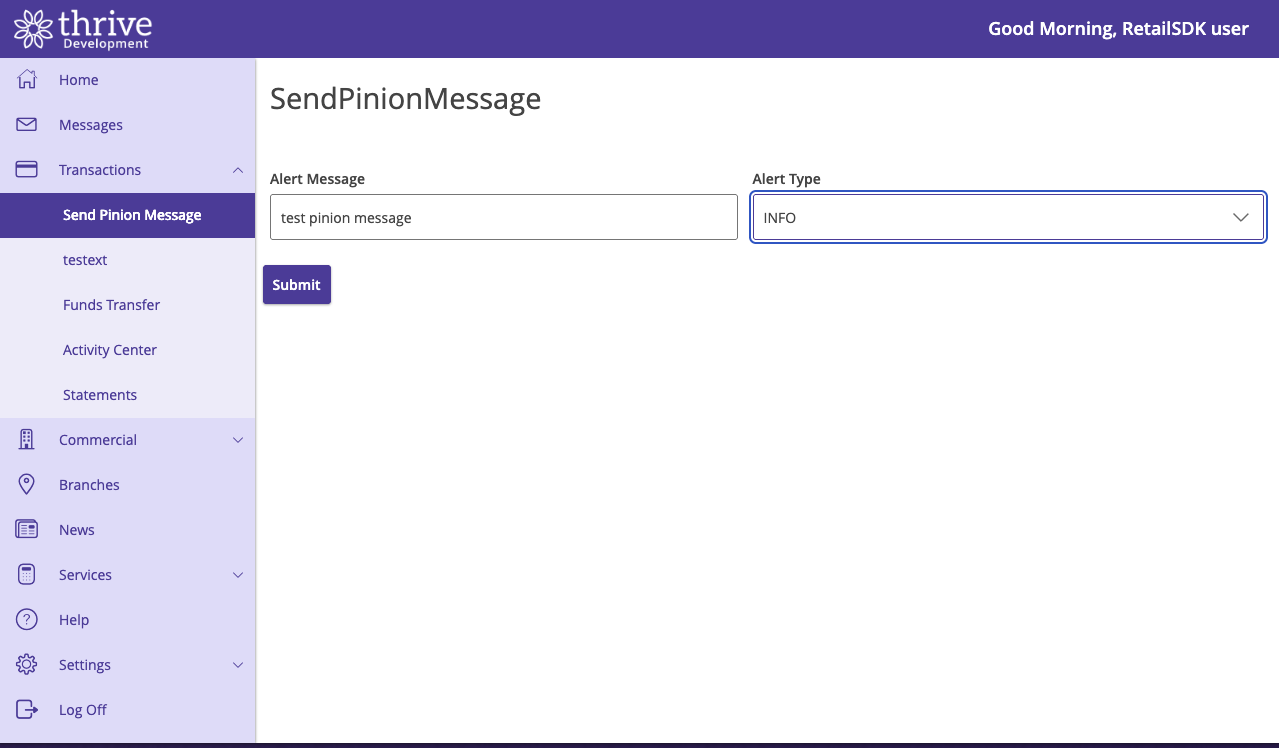 Submit an alert (e.g., message: “Hello from Pinion!”, type